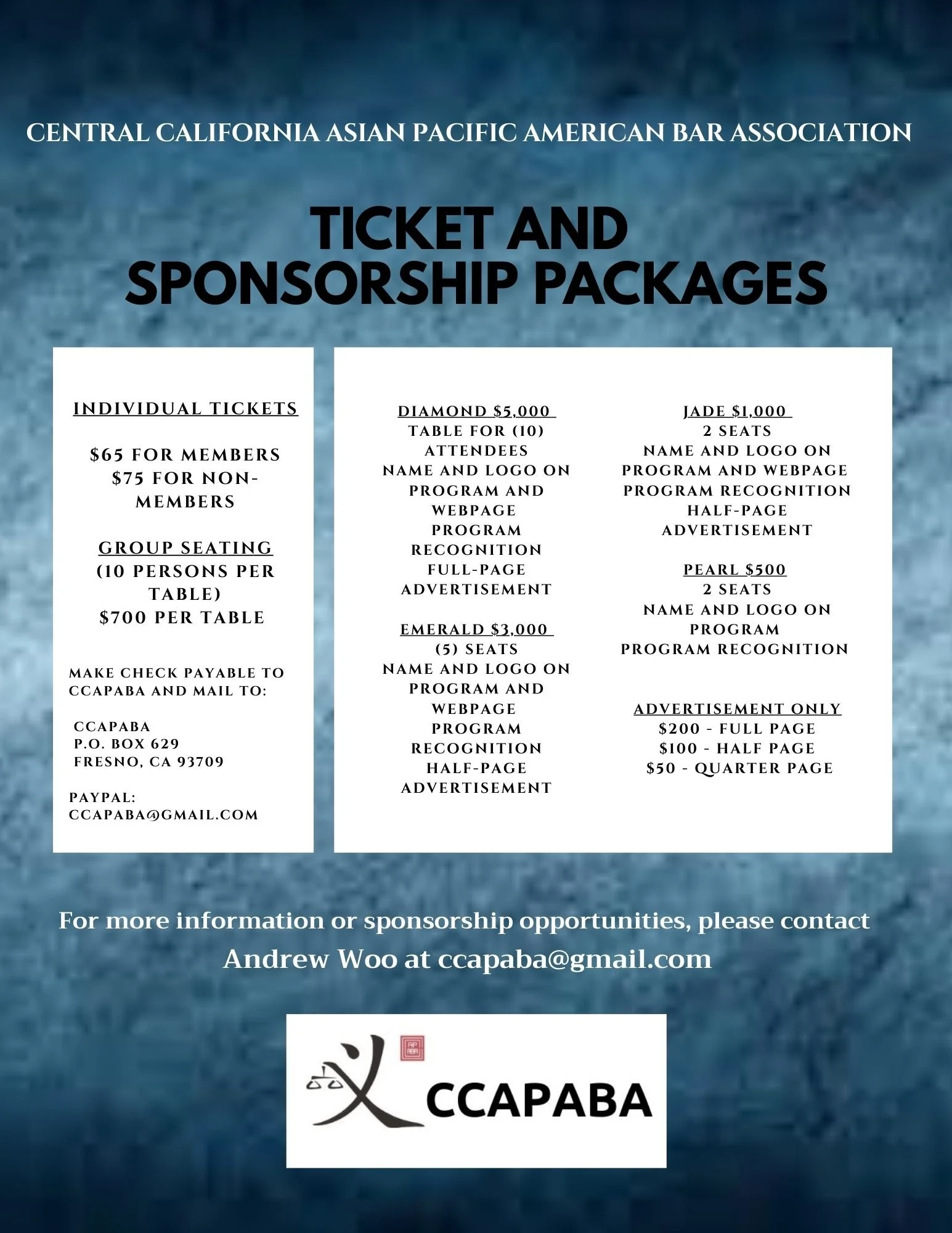 Individual Tickets Only: click this link to pay. EMAIL CCAPABA@GMAIL.COM FOR SPONSORSHIPS AND ADVERTISEMENTS